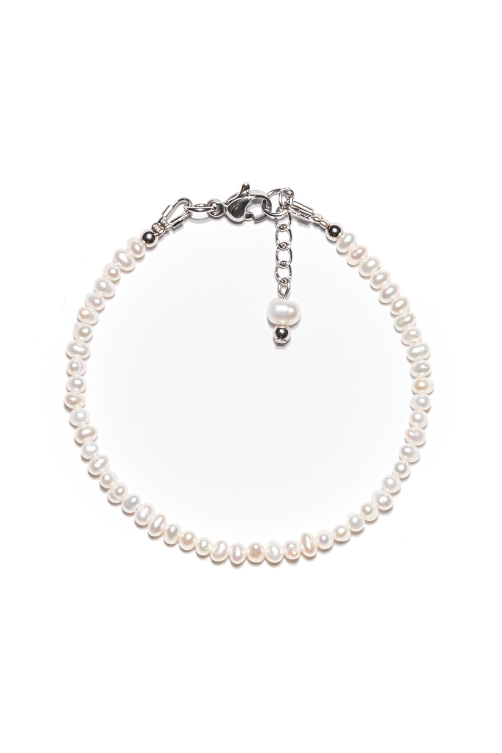 Jemný náramok vhodný na akúkoľvek slávnostnú príležitosť aj na každý deň. Je vyrobený na Slovensku v dielni TopTob z drobučkých riečnych perličiek na oceľovom lanku, doplnený nerezovou karabínkou a guľôčkami.